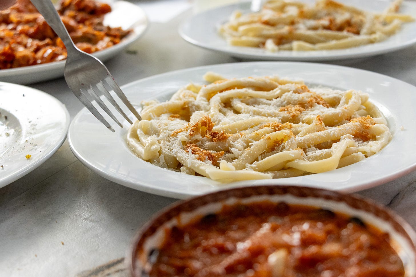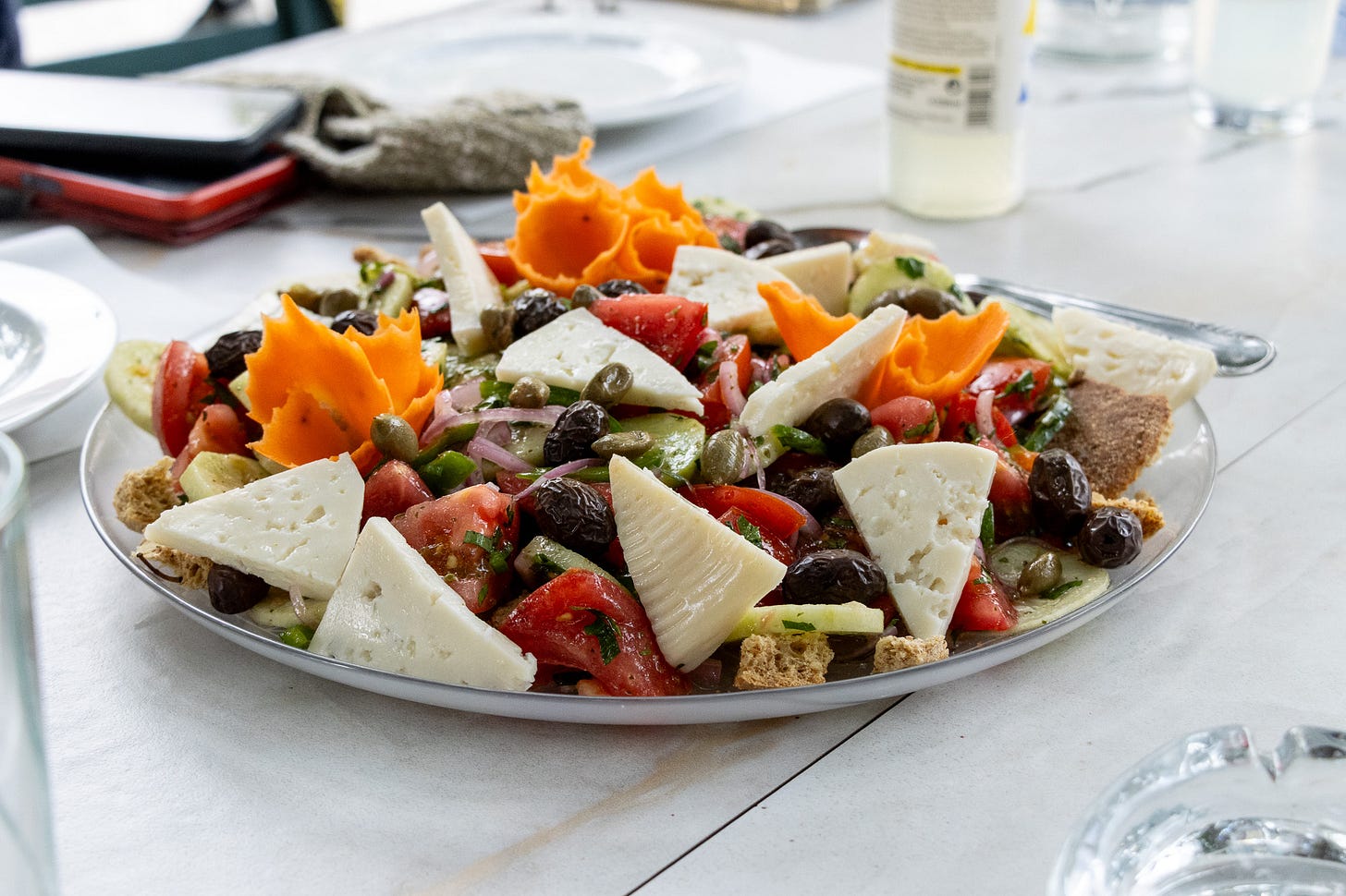 She strives to preserve the stories and traditions linked to each recipe. Before she brought out the handmade pasta, one of the village specialties, she demonstrated how each piece was made, rolling a simple dough of flour and water between her palms, around the stem of a broom plant. Women still roll each piece by hand, sitting on the steps in front of their homes, sharing news and gossip. The pasta is dried and boiled, then served with grated goat cheese and cheese fried in olive oil. Along with the handmade pasta, Evi served rooster in an aromatic red sauce of chopped cherry tomatoes and onion. The rooster was Evi’s own bird, and it was tender and perfectly complemented Pitios’s signature dish.