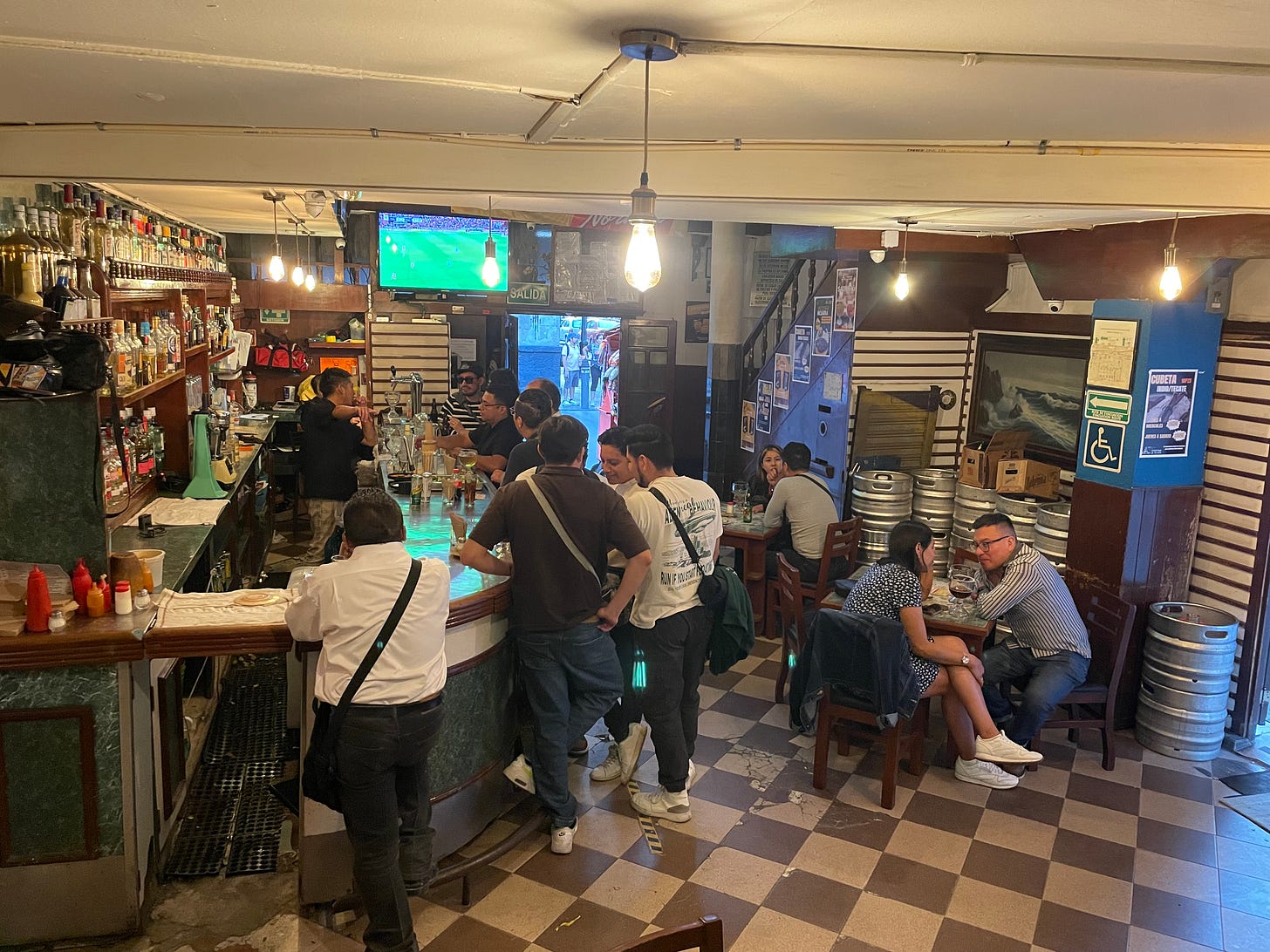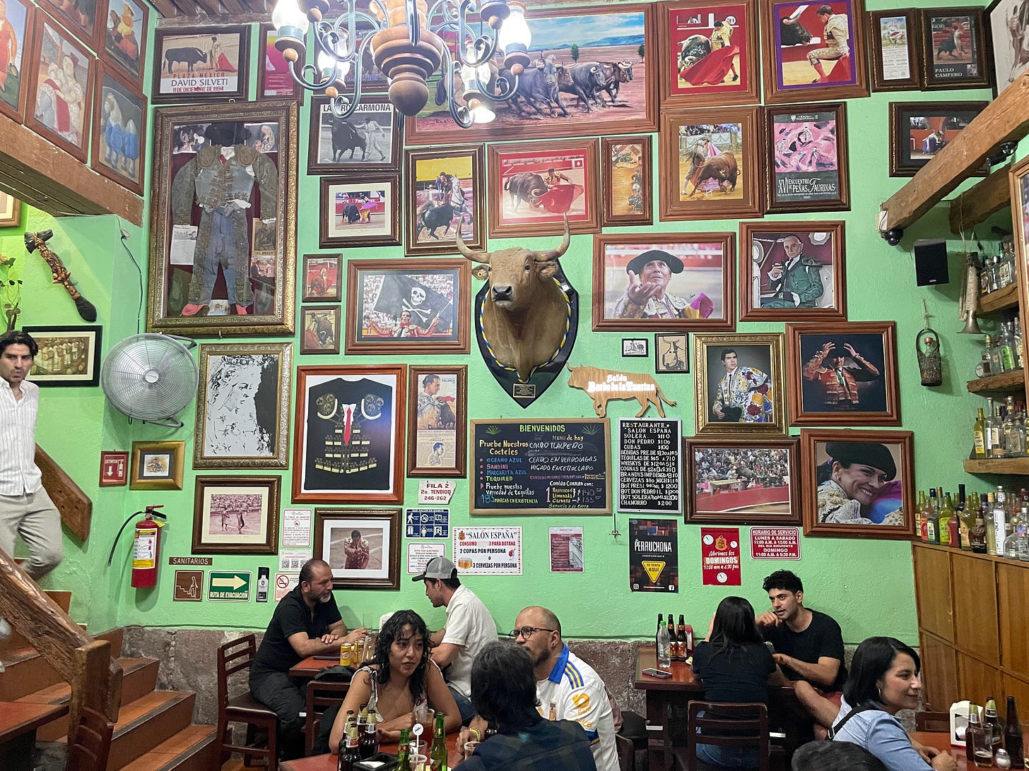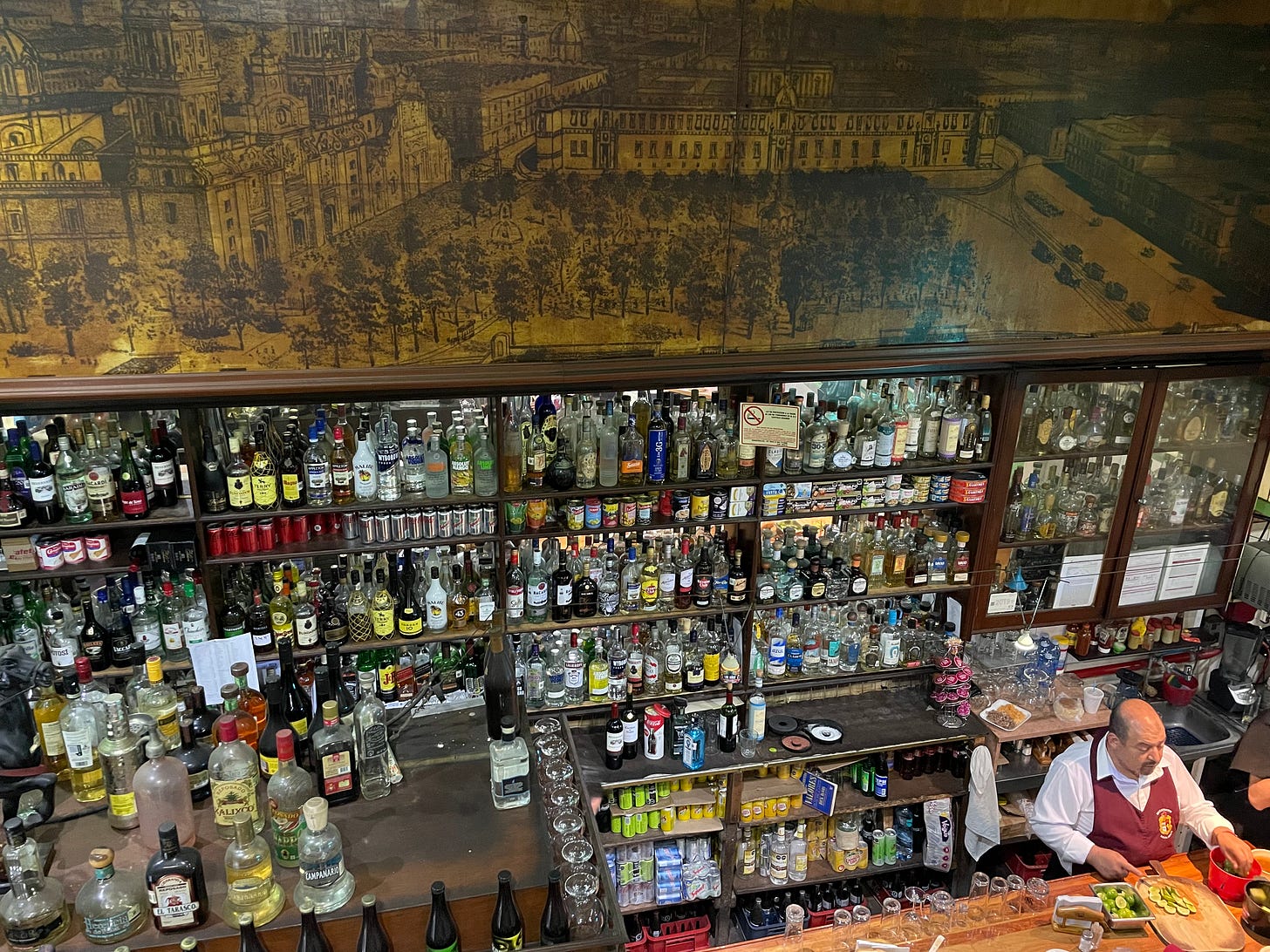 The bar was as full of life as the busy street. Inside the two-story building, my friend and I observed a constellation of Mexican society. Bar staff ran up and down the stairs in matching uniforms while university students, office workers and families sipped beer, watching soccer and listening to a jukebox.