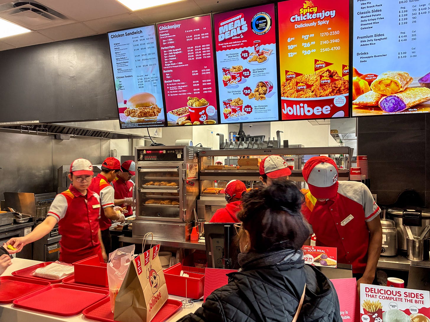 Inside, Filipinos in matching Bass Pro Shop trucker hats were wrapping spaghetti around their forks as teens collected large brown take-out bags. A cheerful employee took my order: Chickenjoy fried chicken and gravy, Jolly Spaghetti, a side of adobo rice and a mango coconut quencher. I sat at a communal table with stools, next to a family whose dad—chicken in one hand, phone in the other—didn’t seem to notice, or mind, his daughter’s face smothered in red sauce.