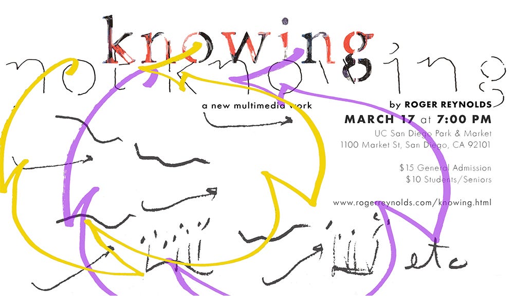 I was recently involved in creating and presenting an ambitious multimedia performance in San Diego, a composition titled “KNOWING / NOT KNOWING.” Its subject is how knowledge arises in our and other societies. That may sound formidable but the formative ideas were not offered in dry, lecture-like fashion. Technological resources included massive digital screens, video projection, sound spatialization and computer-controlled lighting. I took pains to ensure the text was eloquent and understandable, that the combination of live performers and previously videotaped ones was engaging (even to neighborhood children who were seen in the audience during the 90-minute show). Part of the evening was devoted to what those who lived near the downtown venue were thinking about their own lives. They contributed epigrammatic thoughts about their circumstances and dreams, and their eloquence and depth was impressive.