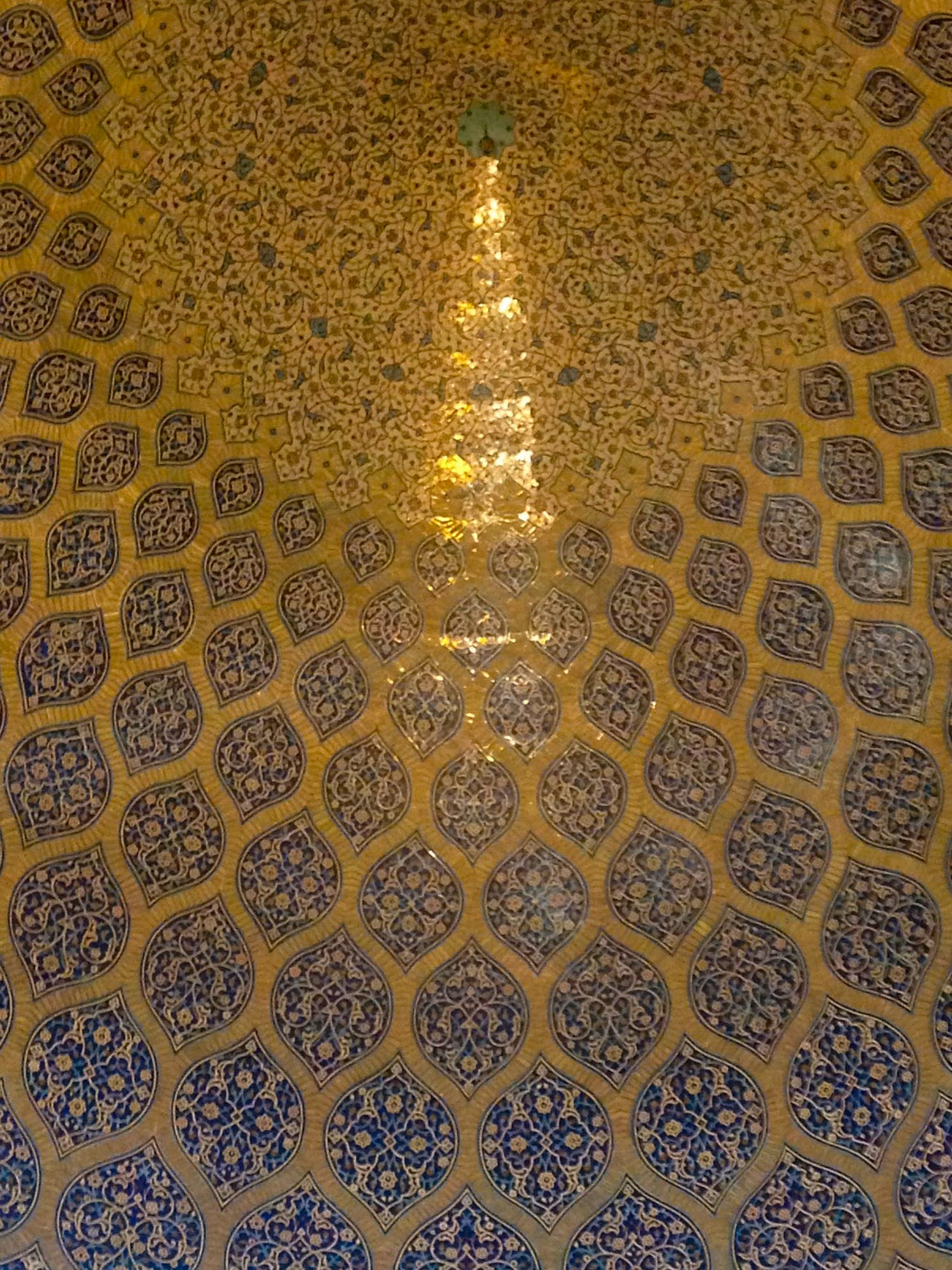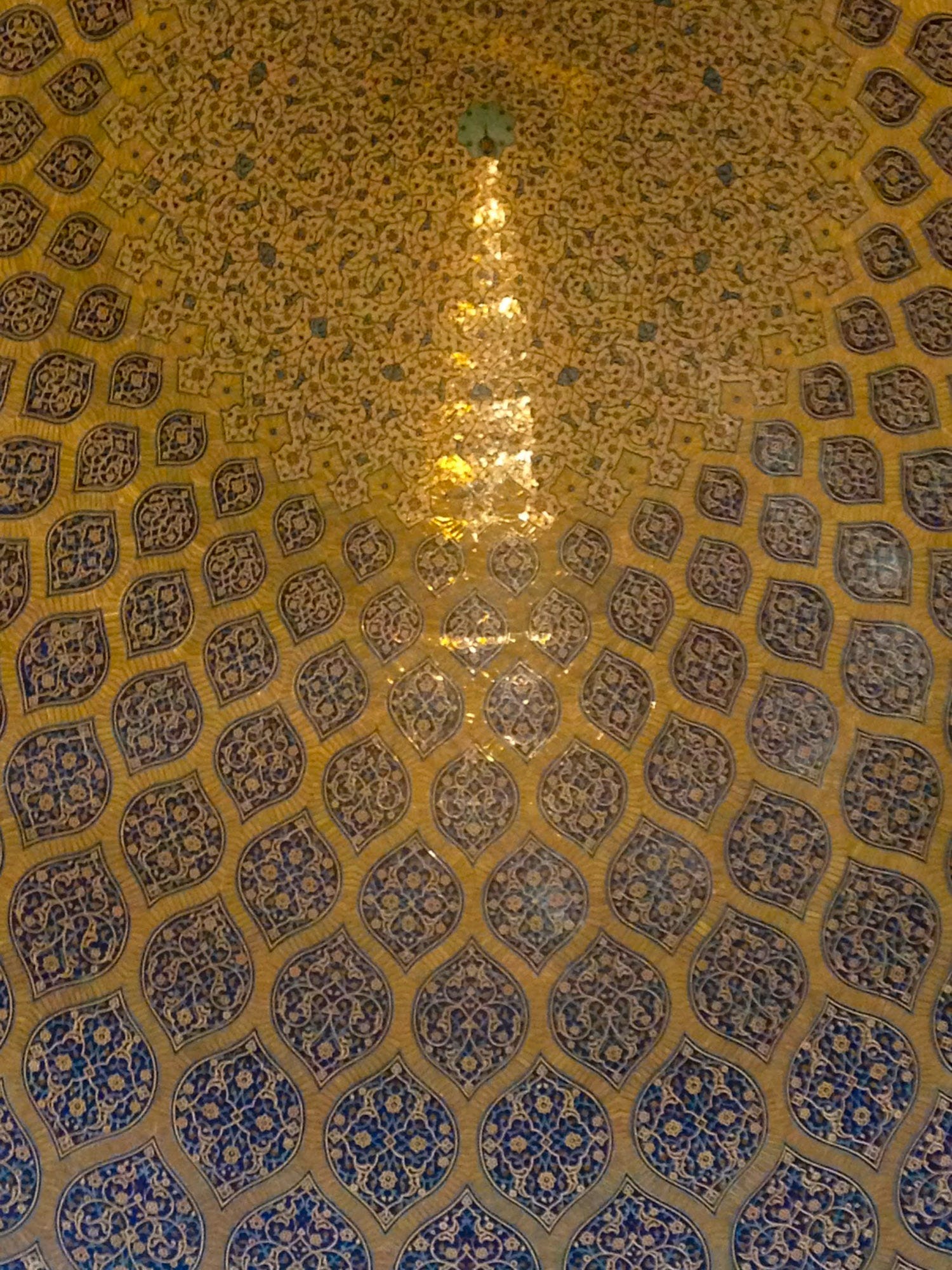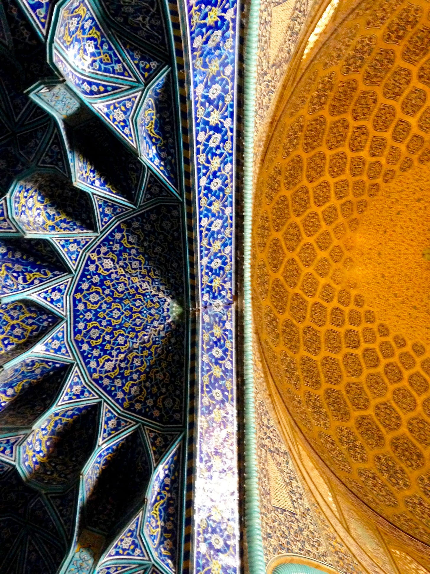 Inside the mosque, walls are covered with intricately decorated blue tile mosaics and an ornate golden dome, the two connected by elaborate muqarnas. Today, this contrast of blue and gold is referred to colloquially as the “day and night ceiling,” one of those spots where photographers like I wait in line to lie on the floor to get a perfect shot.