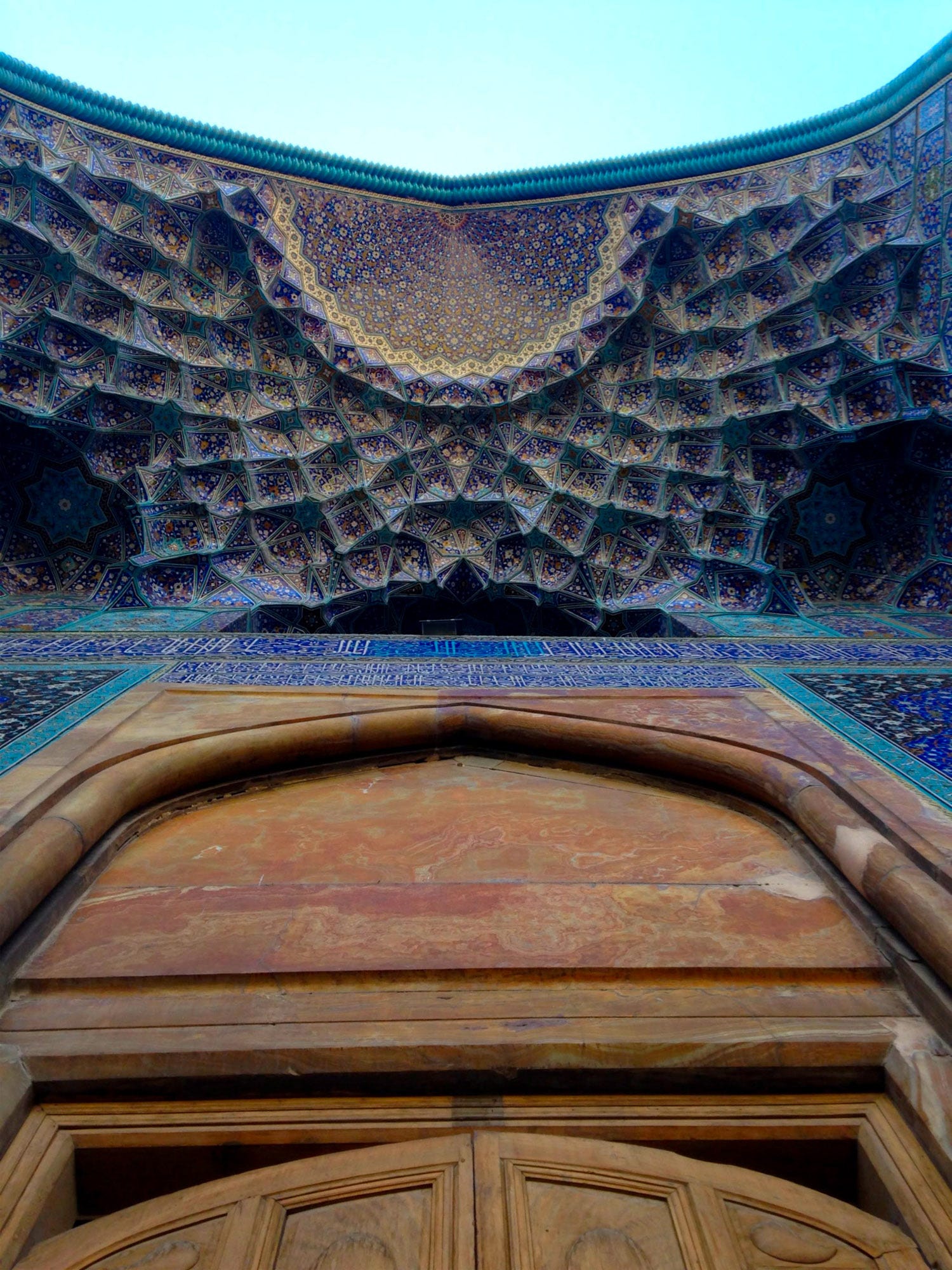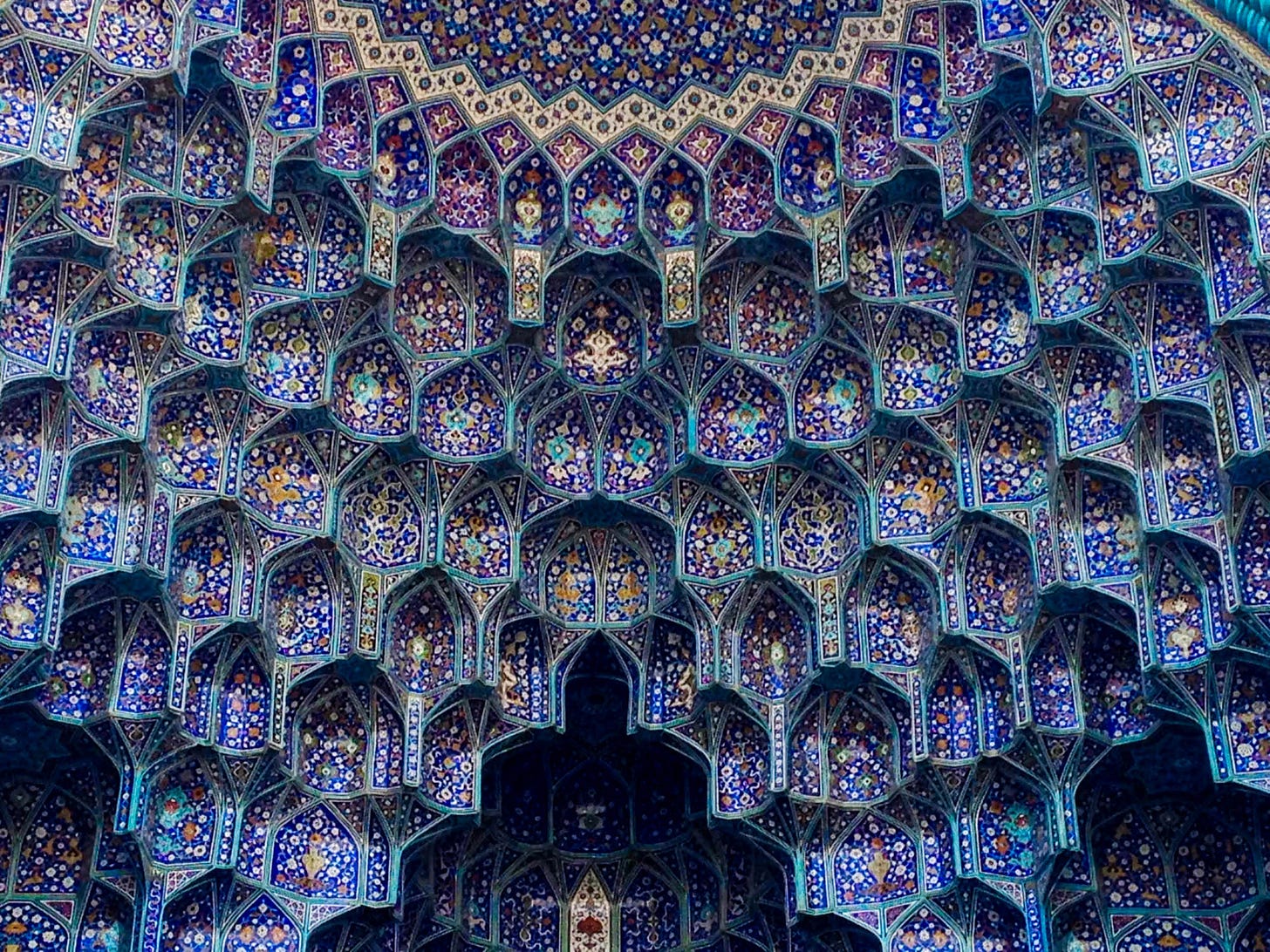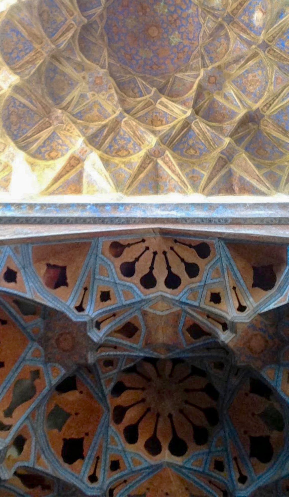 Inside the mosque, walls are covered with intricately decorated blue tile mosaics and an ornate golden dome, the two connected by elaborate muqarnas. Today, this contrast of blue and gold is referred to colloquially as the “day and night ceiling,” one of those spots where photographers like I wait in line to lie on the floor to get a perfect shot.