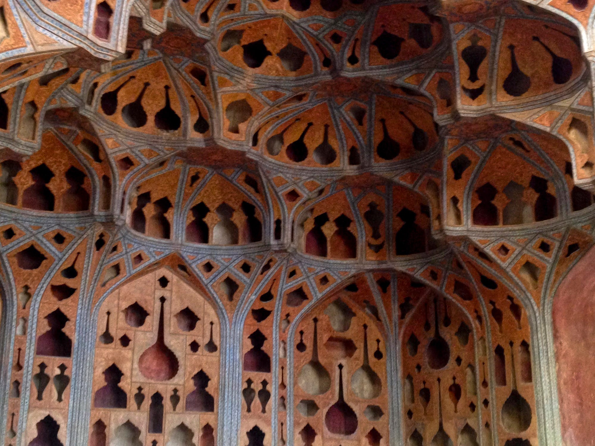 According to the University of Isfahan’s Professor Mehrdad Hejazi, the plaster is so delicate that it “falls to pieces at the slightest touch.” The ceiling also features muqarnas, stalactite-like protrusions that are Islam’s unique contribution to world architecture. Typically, muqarnas are used to make the transition of a dome or drum onto square supporting walls instead of the pendentives, squinches and corbelling typical of European architecture. Muqarnas are also used decoratively in archways and niches.