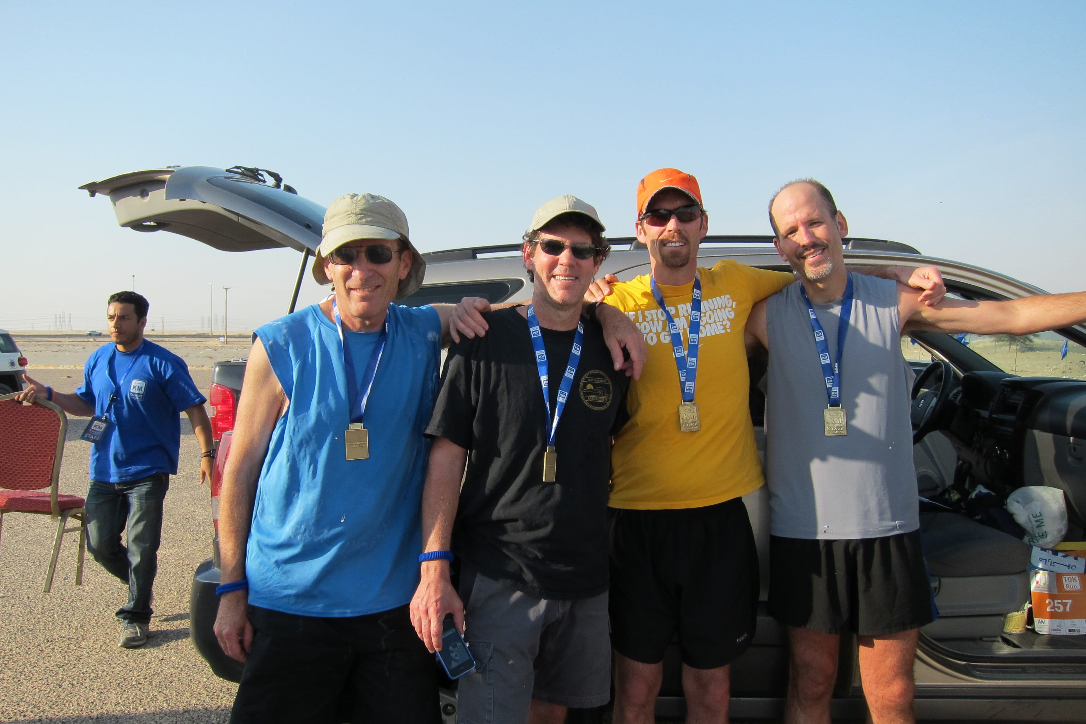 Novembers in Kuwait can be quite cool: sweater weather. Race day, however, dawned warm. We all wore nylon singlets and running shorts. To prevent sunburn, we had coated our exposed areas with SPF 50. To prevent chafing, we had lubed up. To stave off exhaustion, we had stuffed our pockets with espresso energy gels. Everyone carried water bottles. We wore hats. John and Jamie wore long-billed running caps. I wore a cap with a Foreign-Legion style neck guard. David was bald and hatless.