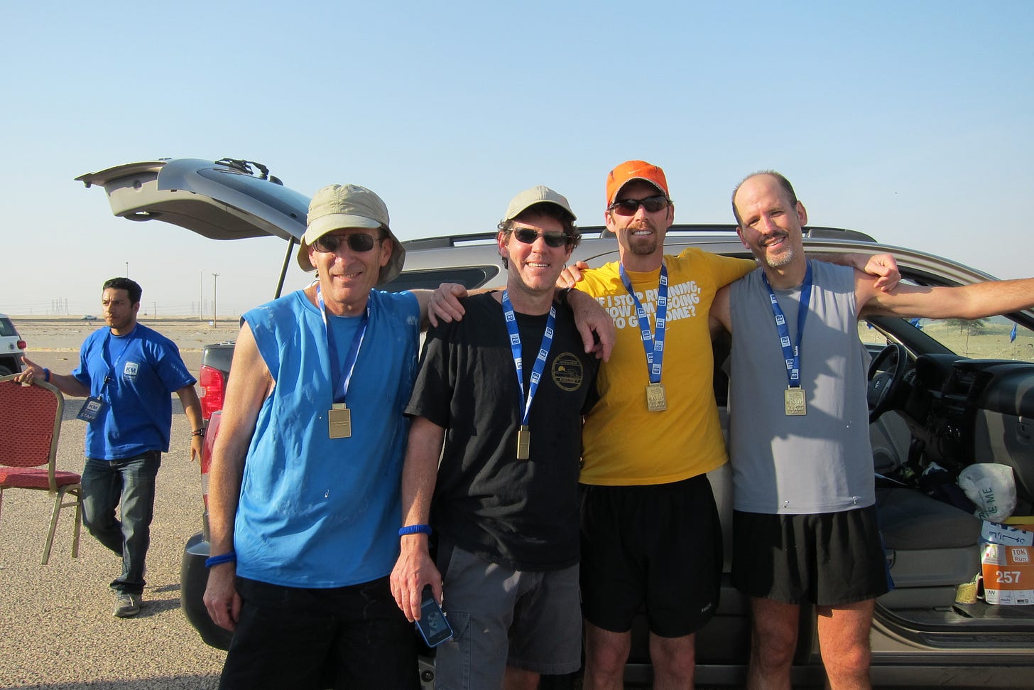 The final miles of the racecourse paralleled the Highway of Death. John and I began to walk-run-walk-run-walk. The sky was a brilliant blue, the sun an unblinking Sauron’s eye. Except for our breathing, the clump of our feet on the sand and the occasional blast of furnace air as vehicles shot by, the desert was quiet. It was nearly 2:30 in the afternoon when John and I sprinted across the finish line together, hands clasped high. Except for Jamie, Christina and a race official who handed us faux-bronze participation medals, the place was deserted. The sponsor and his Ferrari were gone, the buffet was gone, the ambulance was gone. All that remained were the stripped tent and several bricks of Abraaj water. Jamie handed us water bottles. Christina looked anxious.