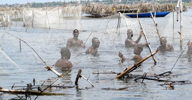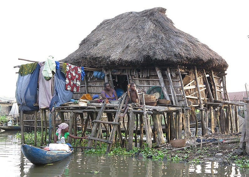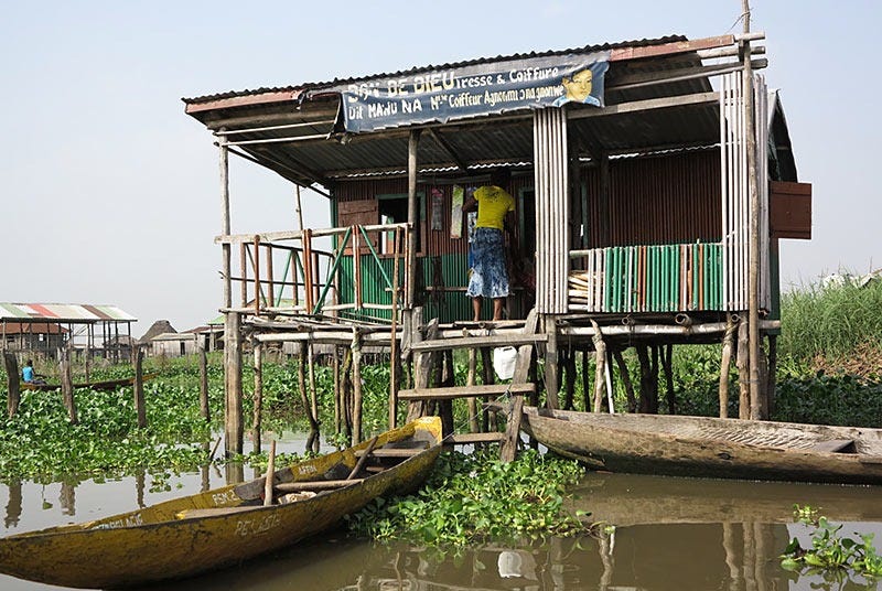 Though no longer threatened by roaming warriors, Ganvié's people preserve their watery way of life even today. Even when they leave Ganvié and Lake Nokué. A much larger water village : Makoko, Nigeria, recently dismantled by Nigeria's government in the interest of land developers, was entirely created by immigrants from nearby Ganvié. While seeking work outside their homeland, Ganvié's emigres had sought their own element : the water.